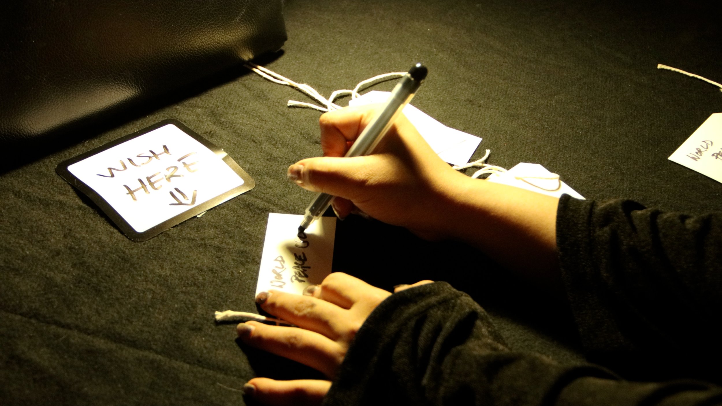 Adjacent to this ritual space is a writing table, where the act of composing a wish becomes the point of tension. When a participant approaches the table, a focused overhead light activates, sharply illuminating the surface and marking the moment as observed. A close-up camera positioned above the table records both the movement of writing and the written content itself.