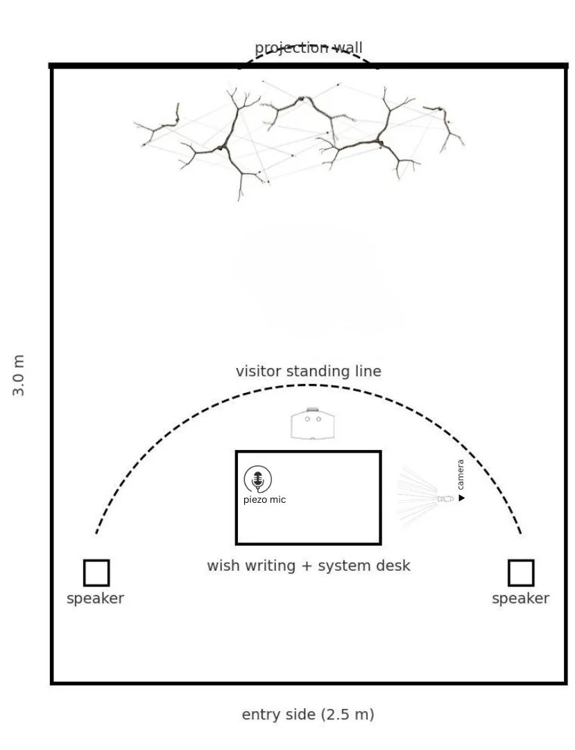 The work emerged from an interest in the cultural belief that wishes lose their power once they are shared. Rather than treating this belief symbolically, the project stages it spatially: the act of wishing is placed under direct observation. What is traditionally a quiet, personal gesture becomes exposed, processed, and re-rendered through a system that attempts to understand it, yet inevitably misinterprets it.