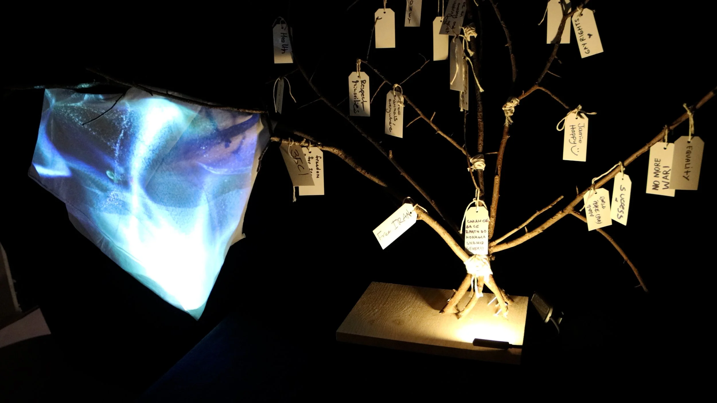 Generated images are displayed on a cloth surface attached to a secondary branch, forming a visual echo of the original wish, interpreted by the system.